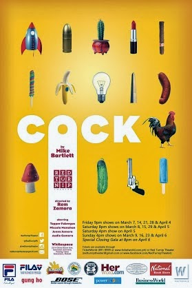 Cock will be staged at Whitespace — 2314 Chino Roces Ave. Extension (formerly Pasong Tamo Extension), Makati — on March 7, 14, 21, 28 and April 4 (Friday, 9 p.m.); March 8, 15, 29 and April 5 (Saturday, 8 p.m.); April 5, Saturday at 4 p.m.; March 9, 16, 23 and April 6 (Sunday, 4 p.m.) and special closing gala on April 6, Sunday, 8 p.m.